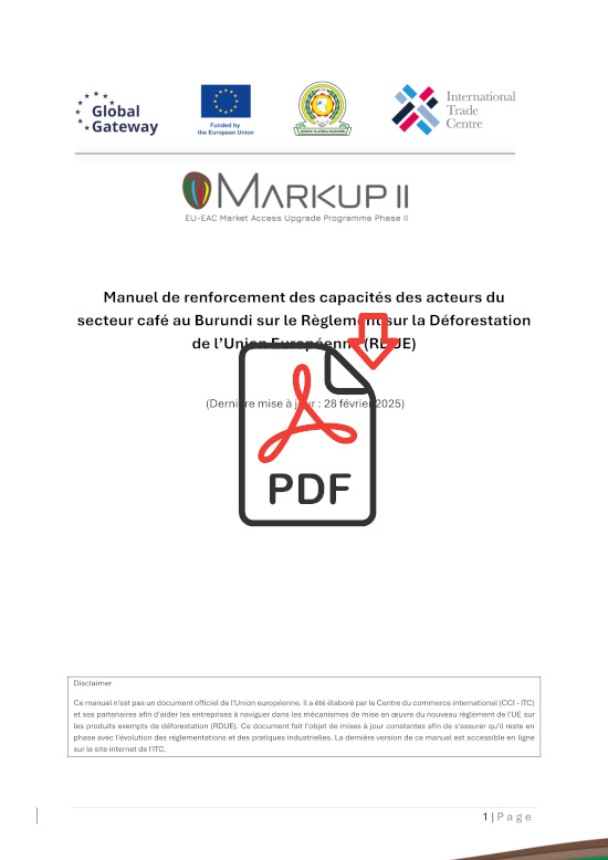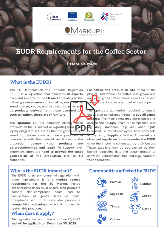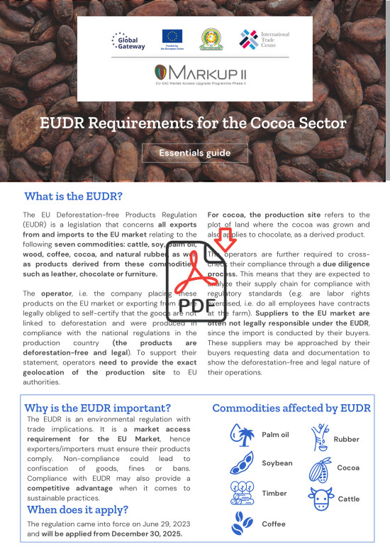 Under the MARKUP II, ITC provides targeted support to coffee, cocoa, and leather producers in East Africa to help them meet EUDR requirements. With tailored technical assistance, MARKUP II addresses the specific needs of these sectors in Kenya, Uganda, Rwanda, Burundi, and Tanzania. Through capacity-building programs, training, and resource provision, ITC enables producers and exporters to adapt to EUDR requirements, strengthen market access, and promote environmentally responsible trade.