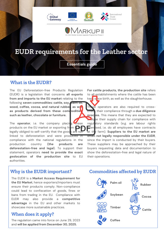 - In Kenya, MARKUP raises awareness on EUDR and implications on leather production as well as best practices enhancing traceability systems and equipping businesses with the tools needed for EUDR compliance.