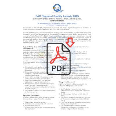The primary objective of the EAC Regional Quality Awards is to foster a culture of quality within the East African Community by encouraging the adoption of standards and quality management practices across EAC enterprises. This, in turn, enhances competitiveness and stimulates trade.