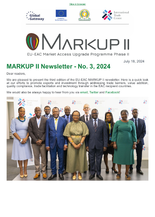 We are pleased to present the third edition of the EU-EAC MARKUP II newsletter. Here is a quick look at our efforts to promote exports and investment through addressing trade barriers, value addition, quality compliance, trade facilitation and technology transfer in the EAC recipient countries.